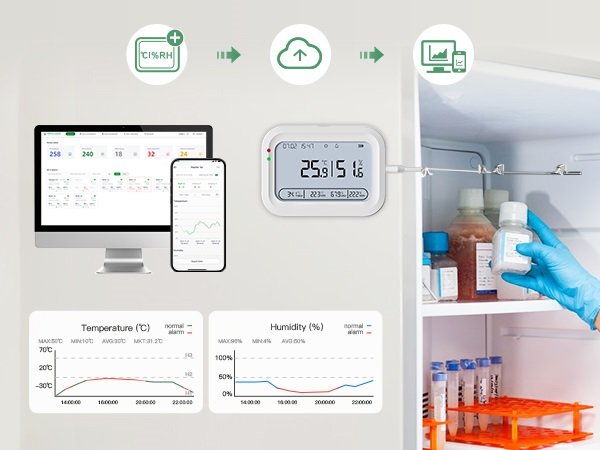 4G real-time data logger automatically uploads data via a built-in 4G SIM card, with no need for Wi-Fi. Direct cellular connection enables seamless setup and real-time tracking, even in mobile or remote environments.